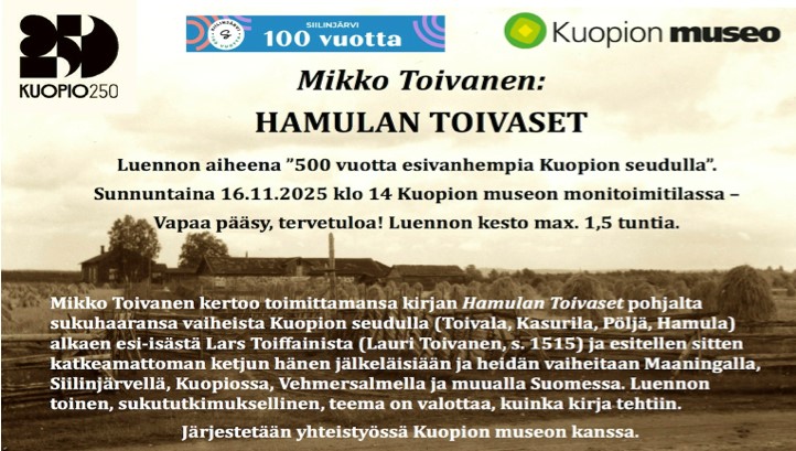 Mikko Toivanen kertoo toimittamansa kirjan Hamulan Toivaset pohjalta sukuhaaransa vaiheista Kuopion seudulla (Toivala, Kasurila, Pöljä, Hamula) alkaen esi-isästä Lars Toiffainista (Lauri Toivanen, s. 1515) ja esitellen sitten katkeamattoman ketjun hänen jälkeläisiään ja heidän vaiheitaan Maaningalla, Siilinjärvellä, Kuopiossa, Vehmersalmella ja muualla Suomessa. Luennon toinen, sukututkimuksellinen, teema on valottaa, kuinka kirja tehtiin.