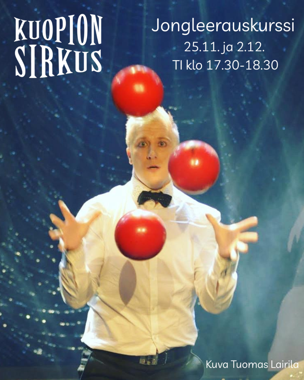 Tämä työpaja sopii kaikille, olitpa sitten vasta-alkaja tai jo hieman kokemusta kartuttanut jonglööri. Työpajassa keskitymme aluksi pallojongleerauksen alkeisiin ja luomme vankan pohjan taidon kehittämiselle.