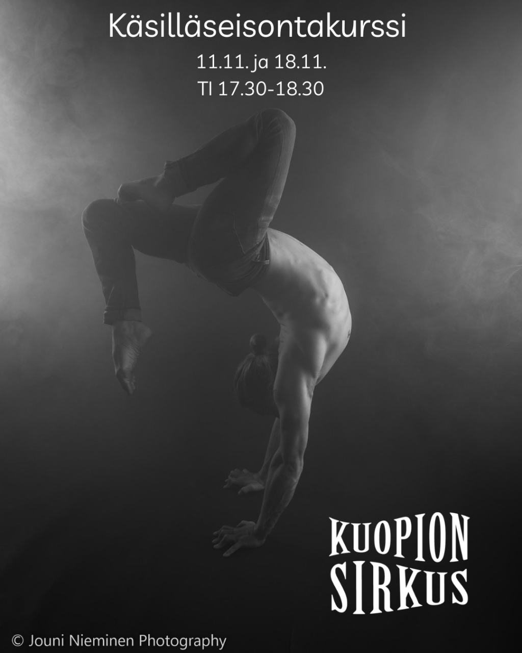 Tällä lyhytkurssilla opit erilaisia harjoituksia kuinka lähteä harjoittelemaan käsilläseisontaa turvallisesti oikeilla linjauksilla ja saat varmuutta liikkeisiin. Kurssilla saat oman tasosi mukaista opetusta yhdeltä Suomen parhaista käsilläseisojista Jukka-Pekka Materolta. Matero on valmistunut Sasakista 2015 sirkusartistiksi ja kiertänyt esiintymässä mm. Vesterinen Yhtyeineen kanssa useamman vuoden ajan.