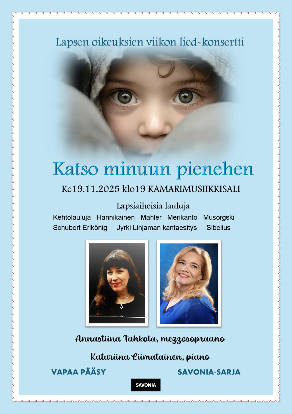 Lapsen oikeuksien viikolla kuullaan lied-konsertti “Katso minuun pienehen”, jonka ohjelma on koottu ainoastaan lapsiaiheisista teoksista.
