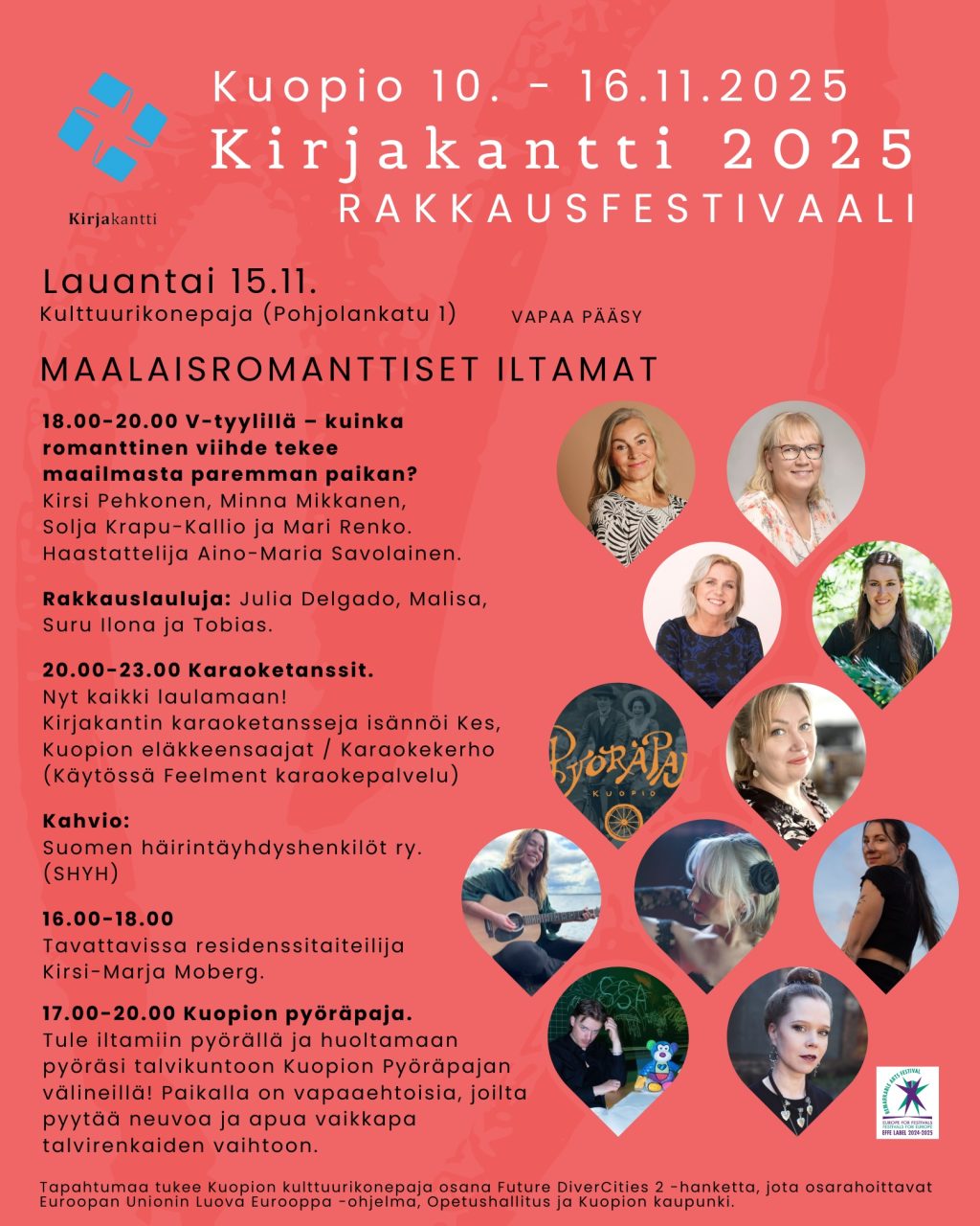 klo 18.00- 20.00 V-tyylillä – kuinka romanttinen viihde tekee maailmasta paremman paikan? Mukana rakkauskirjailijat Kirsi Pehkonen, Minna Mikkanen, Solja Krapu-Kallio ja Mari Renko. Aino-Maria Savolainen haastattelee. Rakkauslauluja haastattelujen välissä laulavat Julia Delgado, Malisa, Suru Ilona ja Tobias.