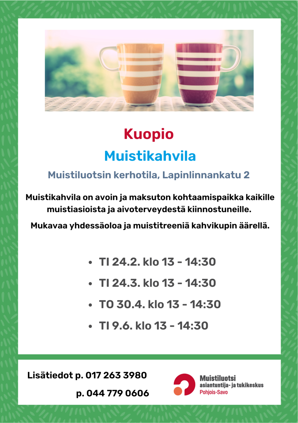 Mukavaa yhdessäoloa ja muistitreeniä kahvikupin äärellä. Lämpimästi tervetuloa!