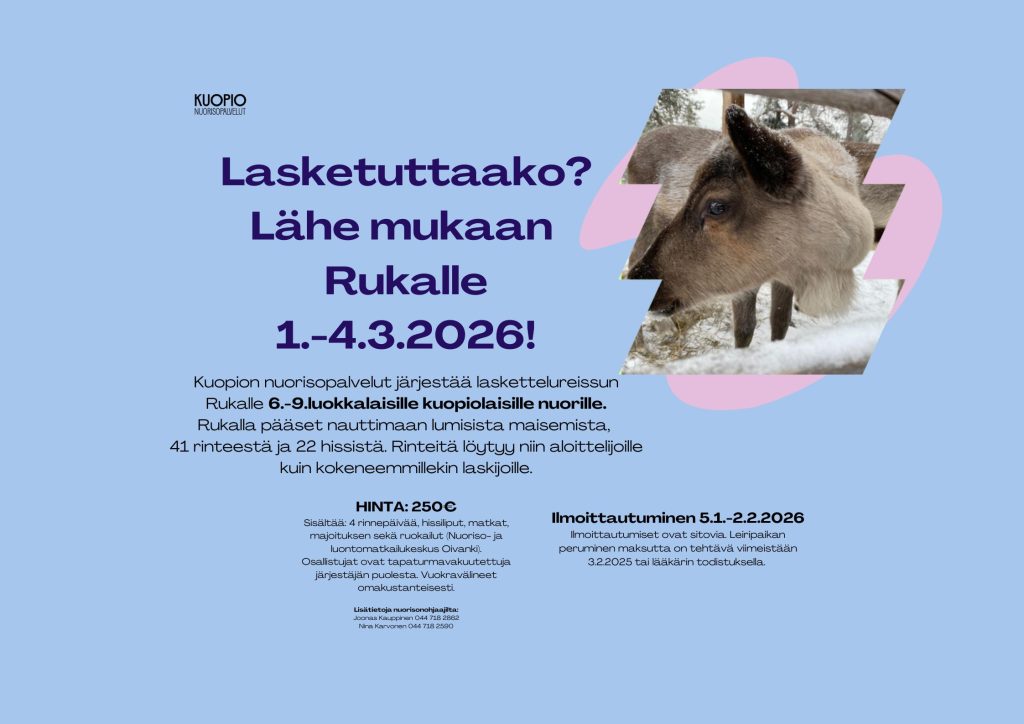Reissu on suunnattu 6.–9. luokkalaisille kuopiolaisille nuorille. Rukalla pääset nauttimaan upeista talvimaisemista, 41 rinteestä ja 22 hissistä. Vaihtoehtoja löytyy niin aloittelijoille kuin kokeneille laskijoille.