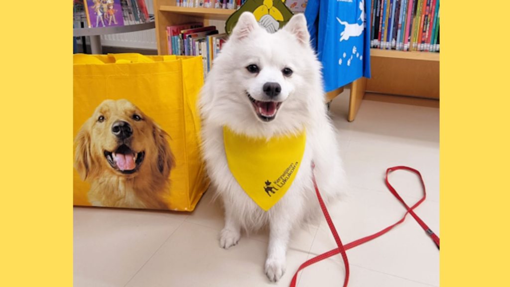 Lukukoira Lumo ohjaajansa kanssa ottaa vastaan lukuharjoittelijoita Maaningan kirjastossa. Jokaisella kerralla on tarjolla 4 lukuaikaa.