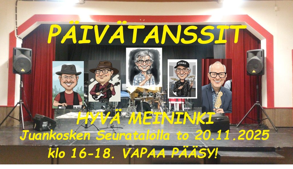 NÄMÄ ILOISET VELIKULLAT ovat tulossa viihdyttämään tanssiyleisöä vuoden 2025 viimeisiin Päivätanseihin Juankosken Seuratalolla torstaina 20.11.2025 klo 16-18! VAPAA PÄÄSY, Juankosken Kuntoilijoiden kahviossa pikkiriikkinen käteismaksu. Järjestäjinä Juankosken pitäjäraati, Kuopion kaupungin Kansalaistoiminta, Juankosken Kuntoilijat ry ja Juankosken Kevyen Musiikin Tuki ry. Tohvelit suihkimaan Hannu Kettunen & Hyvä Meininki- yhtyeen tahdissa. Tervetuloa tansseihin!