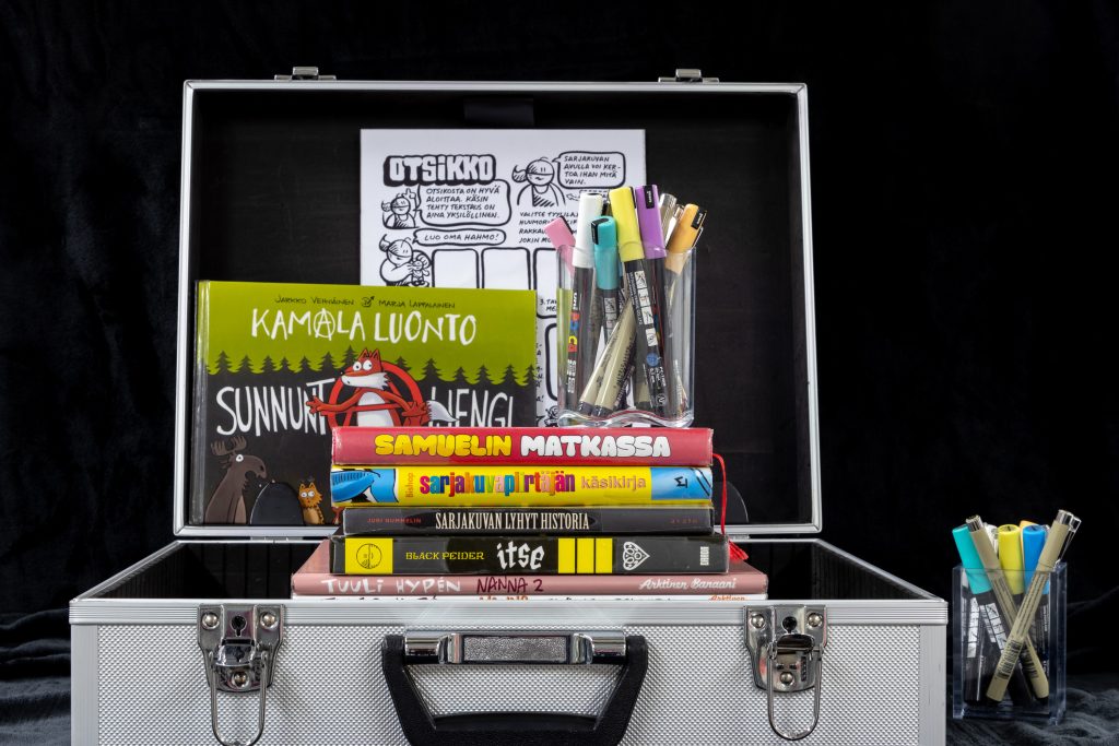 Lainattava sarjakuvasalkku ohjaa oman sarjakuvan tekoon. Mukana on kopioitavia sarjakuvaplansseja, tehtäviä ja sarjakuvakirjoja. Salkku on toteutettu yhteistyössä sarjakuvataiteilija Petteri Tikkasen kanssa. Salkku soveltuu parhaiten yli 10-vuotiaille.