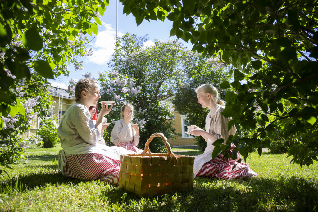 Kuva: Piikojen kahvihetki Korttelimuseon pihamaalla kesällä 2019. Reetta Tiainen. KUHMU.