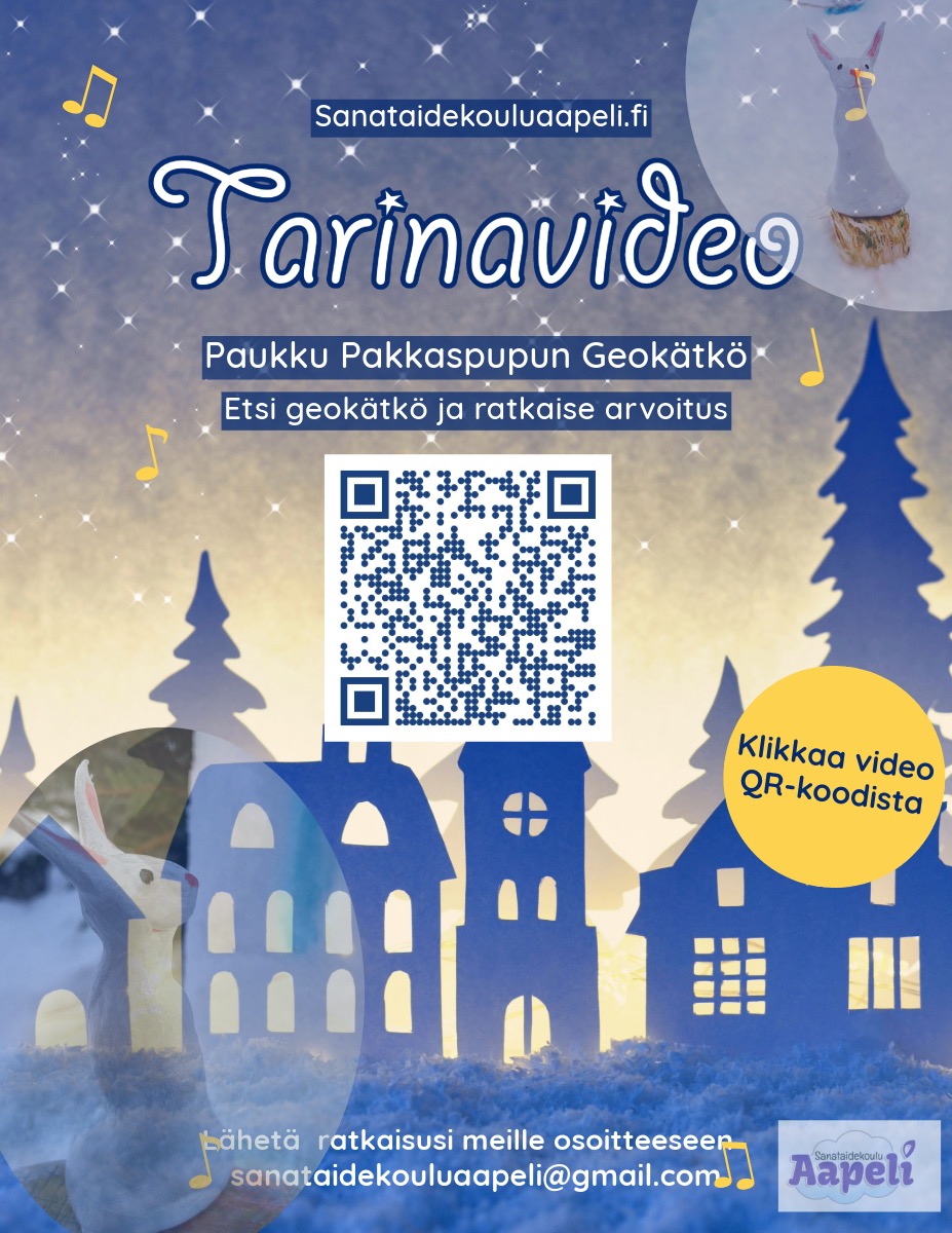 Ratkaise Paukku Pakkaspupun arvoitus. Katso Sanataidekoulu Aapelin video ja etsi Geokätkö. Kätköllä on lisää vinkkejä ja sanataidetehtävä. Lähetä tehtäväsi meille osoitteeseen sanataidekouluaapeli@gmail.com. Laitamme halutessasi näkyviin Aapelin nettisivuille sanataidekouluaapeli.fi Kaikkien osallistujien kesken arvotaan kirjapalkinto.